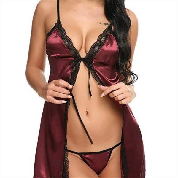• Material: Glossy satin body with intricate black lace overlays, offering a luxurious sheen and soft, non-clingy flow