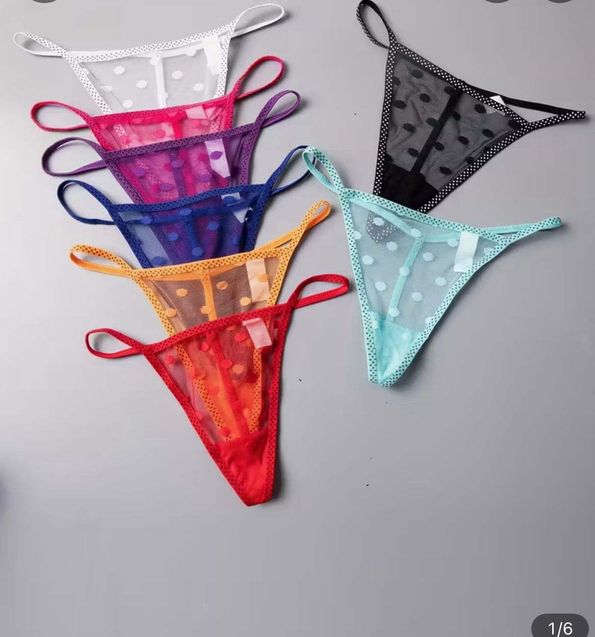 • Description: A vibrant thongs featuring a sheer mesh fabric with polka dot patterns, offering a playful and lightweight design.
